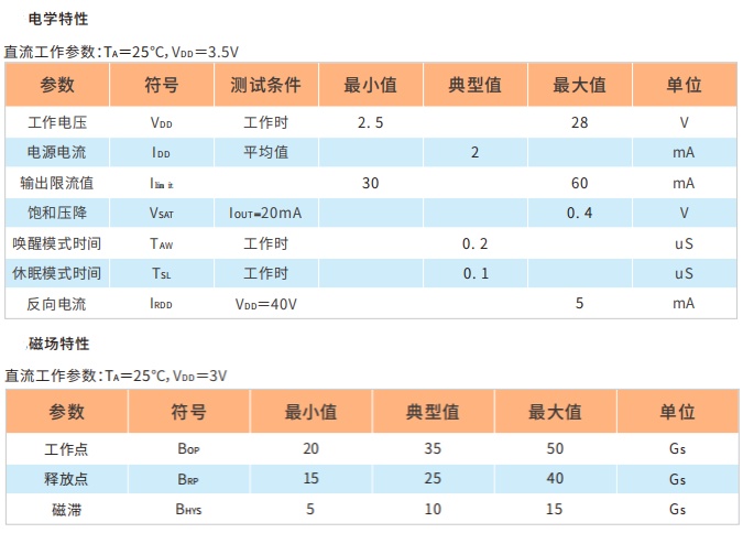 HAL1101B包含稳压输出模块,霍尔薄⽚,信号放⼤模块,动态失调消除模块以及带有限流保护的功率输出级。内置的稳压输出电路模块可以让芯⽚⼯作在2.5V⾄28V电源电压范围。