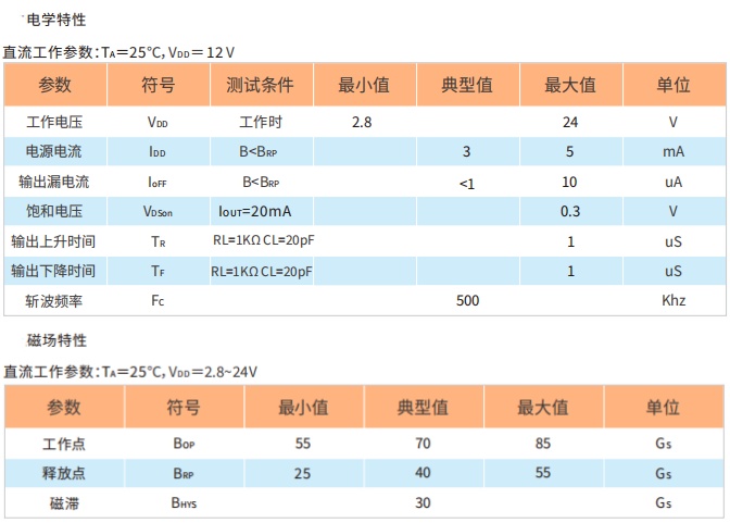 特点: (1)宽工作电压:2.8-24V (2)单极性高灵敏度霍尔元件 (3)优越的温度稳定性 (4)斩波频率:500KHz (5)BCD 工艺 (6)低压启动,汽车工艺 (7)封装:TO-92S/UA、SOT-23/SO (8)工作温度:-40~150°C