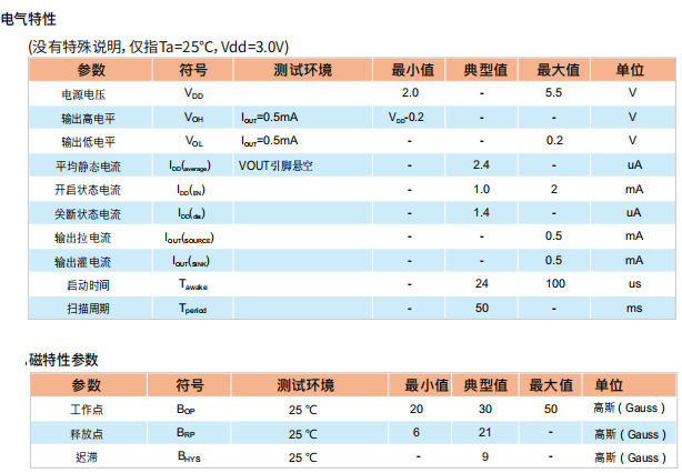 特点: (1)2-5.5V电池供电应用 (2)单极型霍尔元件输出开关 (3)工作频率11Hz (4)CMOS 工艺 (5)低功耗霍尔开关 (6)分S极和N极感应 (7)封装:TO-92S/UA、SOT-23/SO (8)工作温度:-40~85°C