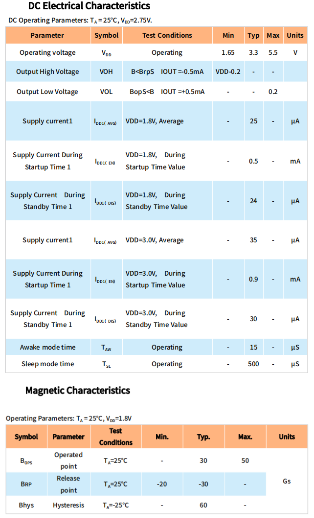 (4)25uA低功耗霍尔元件 (5)CMOS 霍尔集成电路工艺 (6)封装:TO-92S/UA、SOT-23/SO