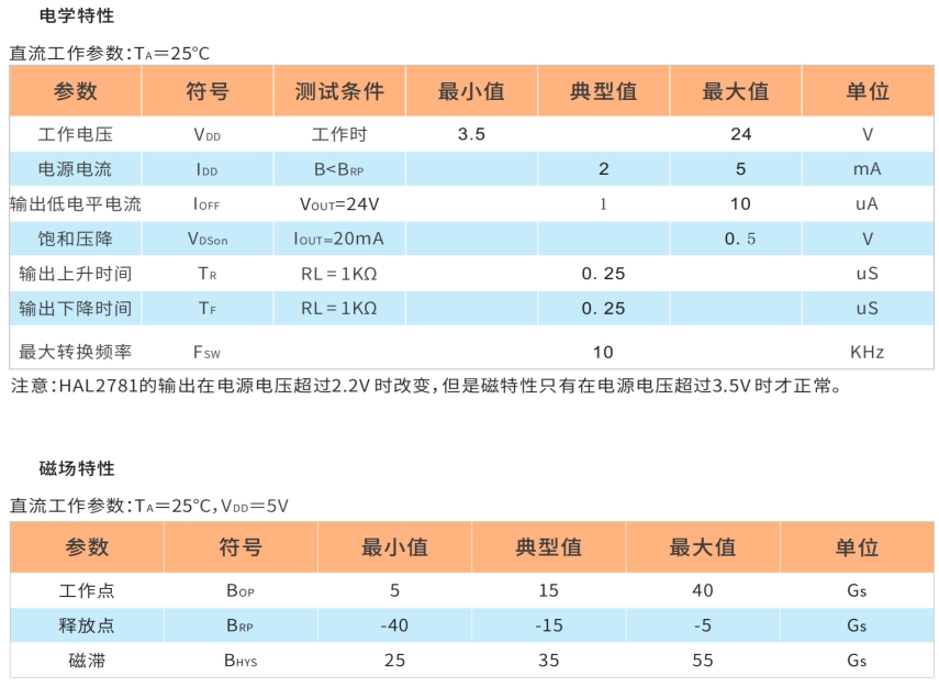 HAL2781是⼀款基于混合信号CMOS技术的双极锁存型霍尔效应传感器,器件内部集成了电压调节器、带动态偏置补偿系统的霍尔传感器、施密特触发器和⼀个开漏极输出驱动,这些都在⼀个封装⾥。