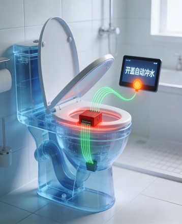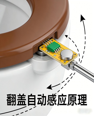 在座圈底部嵌入微型霍尔传感器,对应马桶本体安装小尺寸磁钢。当用户夜间走近并掀起座圈(磁场减弱),传感器输出低电平信号触发LED夜灯开启(亮度15-30lux);使用完毕放下座圈(磁场恢复)后延时30秒自动关闭。该设计功耗<0.5mW,配合人体红外辅助检测可避免误触发,提升夜间使用安全性。