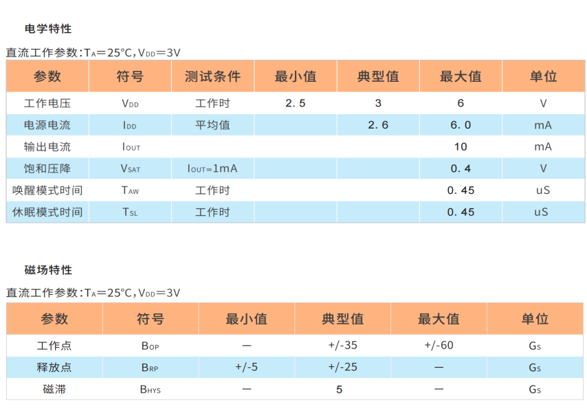 特点: (1)微功耗电池供电应用 (2)高速无极霍尔管 (3)高灵敏度直接簧片开关的替代应用 (4)马达霍尔开关 (5)CMOS 开漏输出 (6)封装:TO-92S/UA、SOT-23/SO (7)高频率10KHZ,无休眠时间 (8)工作温度:-40~100°C 马达霍尔开关,高速无极霍尔管,HAL253霍尔