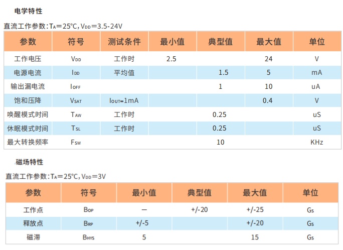 特点: (1)固态稳定性远高于簧片开关 (2)全极高压霍尔芯片 (3)工作电压2.5-24V (4)高灵敏度测速霍尔元件 (5)CMOS 输出 (6)封装:TO-92S/UA、SOT-23/SO (7)宽电压,高频率,无休眠 (8)工作温度:-40~125°C 测速霍尔元件,高压霍尔芯片
