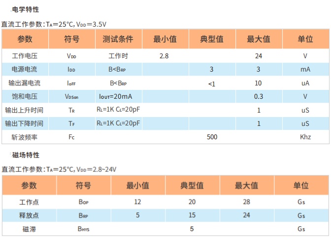 HAL1101A是⼀款采⽤BCD⼯艺⽣产制作的单极型霍尔效应传感器,具备⾼灵敏度、⾼可靠性、⾼稳定性等优势。该产品内部集成了稳压电路、霍尔电压发⽣器、动态偏移补偿系统、施密特触发器、开漏输出等多个模块。⾼达47V的电源耐压与反向保护电路进⼀步提⾼了其可靠性。设计⽤于响应⼀个磁场:N极(SO)或S极(UA),当磁通密度(B)⼤于⼯作点(BOP)时,输出将打开(低),⽽磁通密度(B)⼩于释放点(BRP),输出关闭(⾼)。