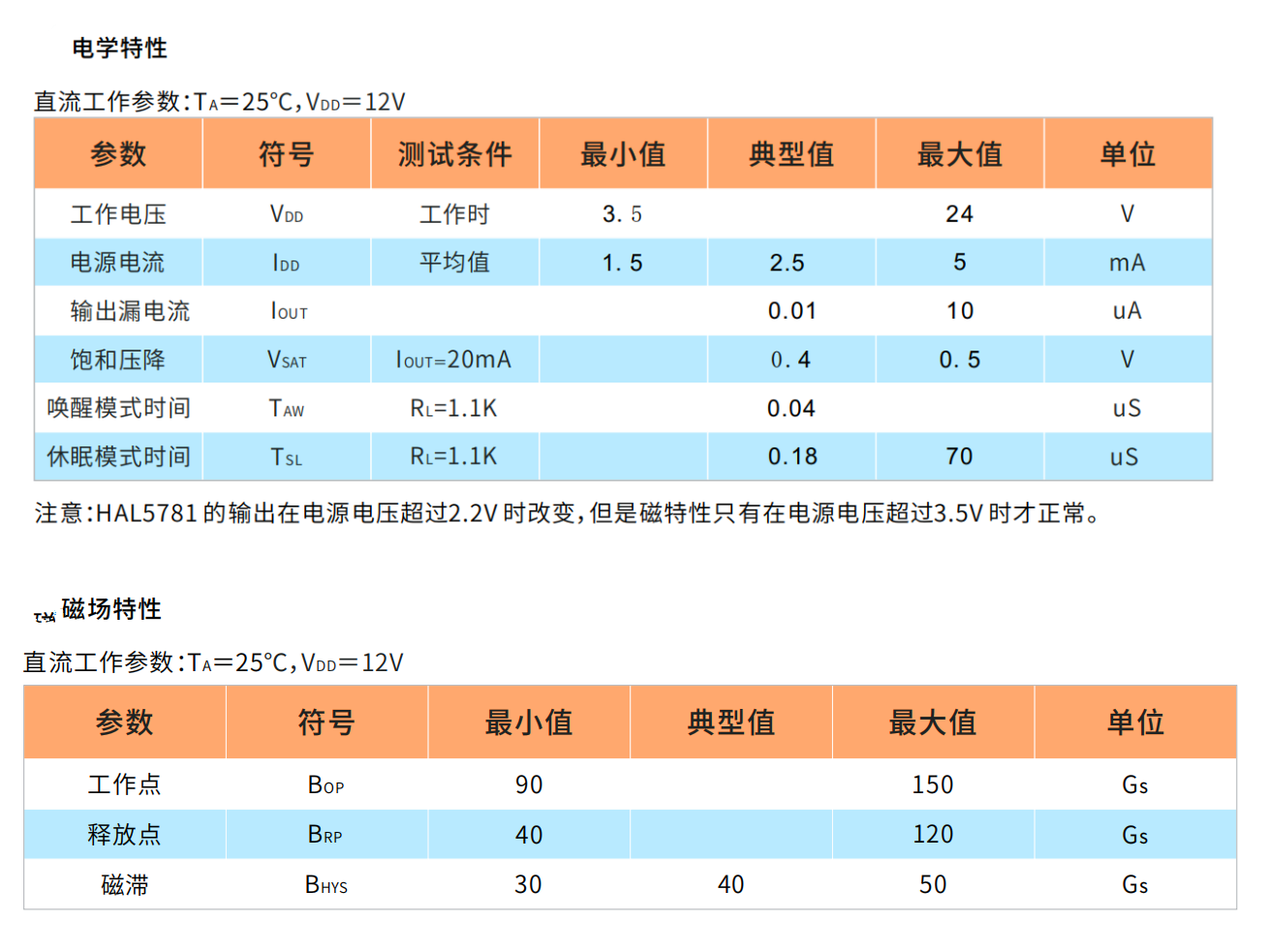 当⾜够强的N极磁场朝向封装有标记的⼀⾯时,HAL5781的输出管打开,输出低(BOP)。同样的,当N极磁场减弱到⼀定数值直⾄变为“0”时,输出管将关闭,输出⾼(BRP)。