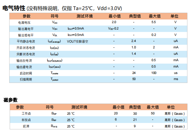 特点: (1)2-5.5V电池供电应用 (2)单极型霍尔元件输出开关 (3)工作频率11Hz (4)CMOS 工艺 (5)低功耗霍尔开关 (6)分S极和N极感应 (7)封装:DFN1006-3L (8)工作温度:-40~85°C