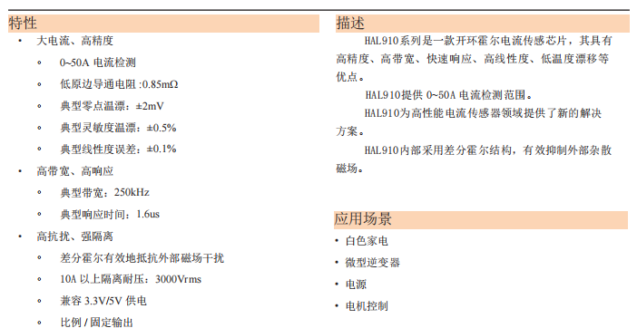 HAL910系列是一款开环霍尔电流传感芯片,其具有高精度、高带宽、快速响应、高线性度、低温度漂移等优点。