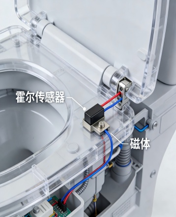 霍尔开关与永磁体分别安装在座圈/盖板铰链处的固定部分和活动部分。当用户翻起或放下座圈/盖板时,两者相对位置变化导致磁场强度改变,霍尔开关输出电平信号跳变。控制器接收信号后判断座圈状态:放下时自动激活人体感应预热功能,启动座圈加热至设定温度(37-40℃);翻起状态下关闭加热以节能,同时男士小便模式自动切换,避免不必要的冲洗动作。