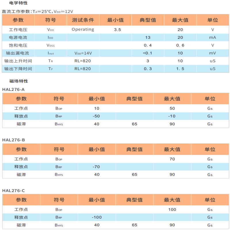 (8)工作温度:-20~85°C HAL276,风扇霍尔开关,直流马达霍尔